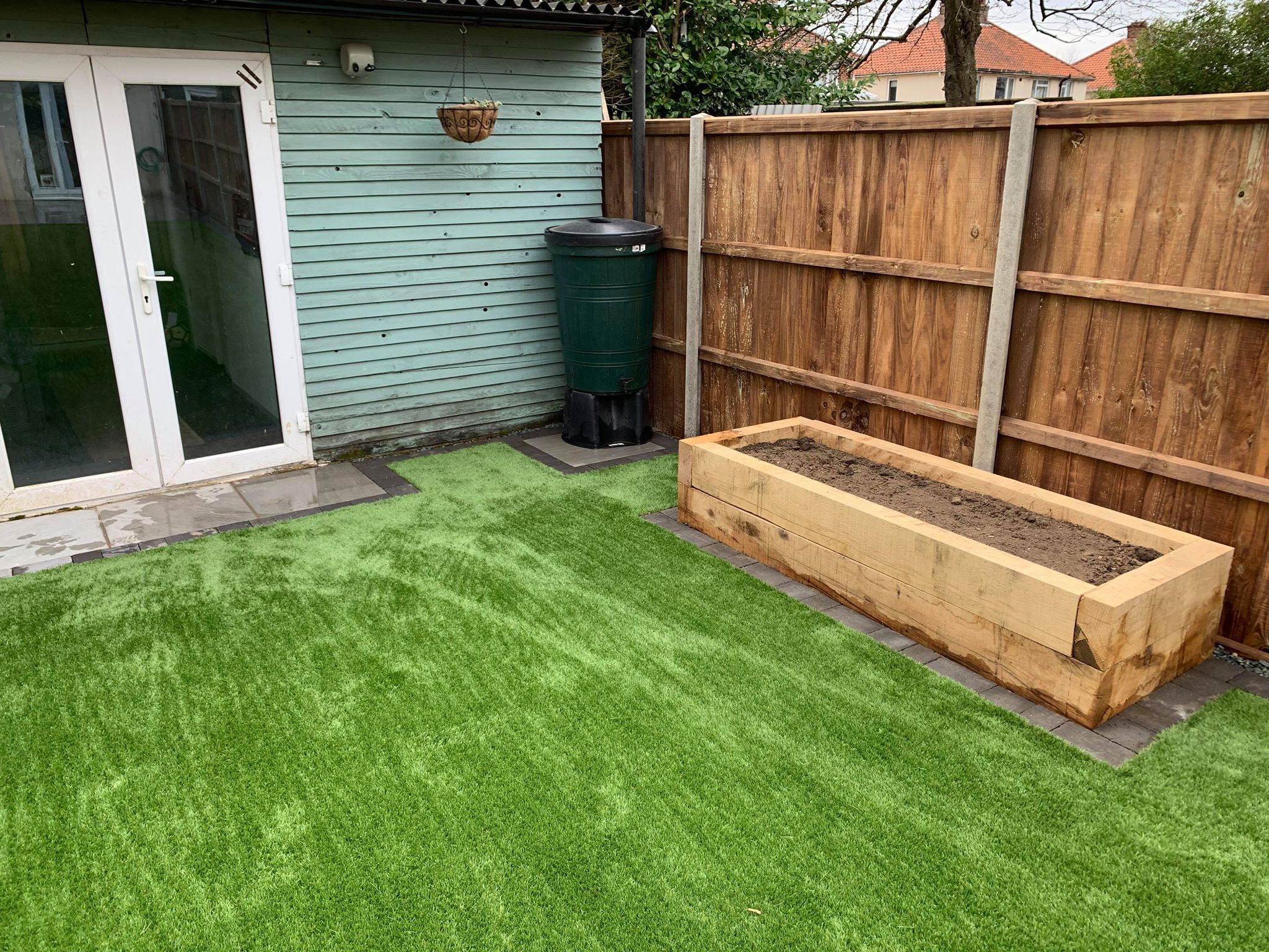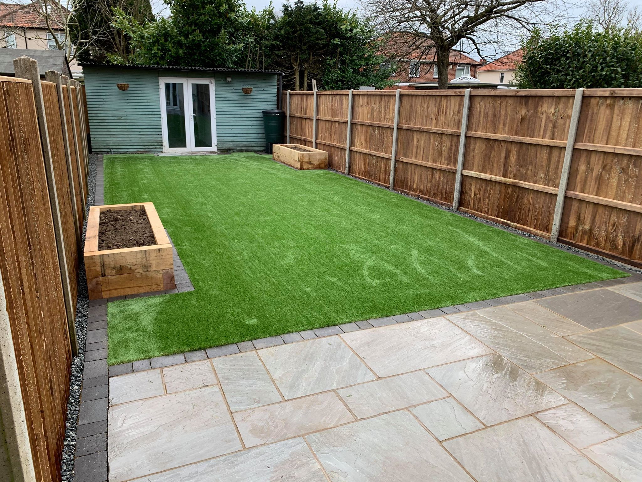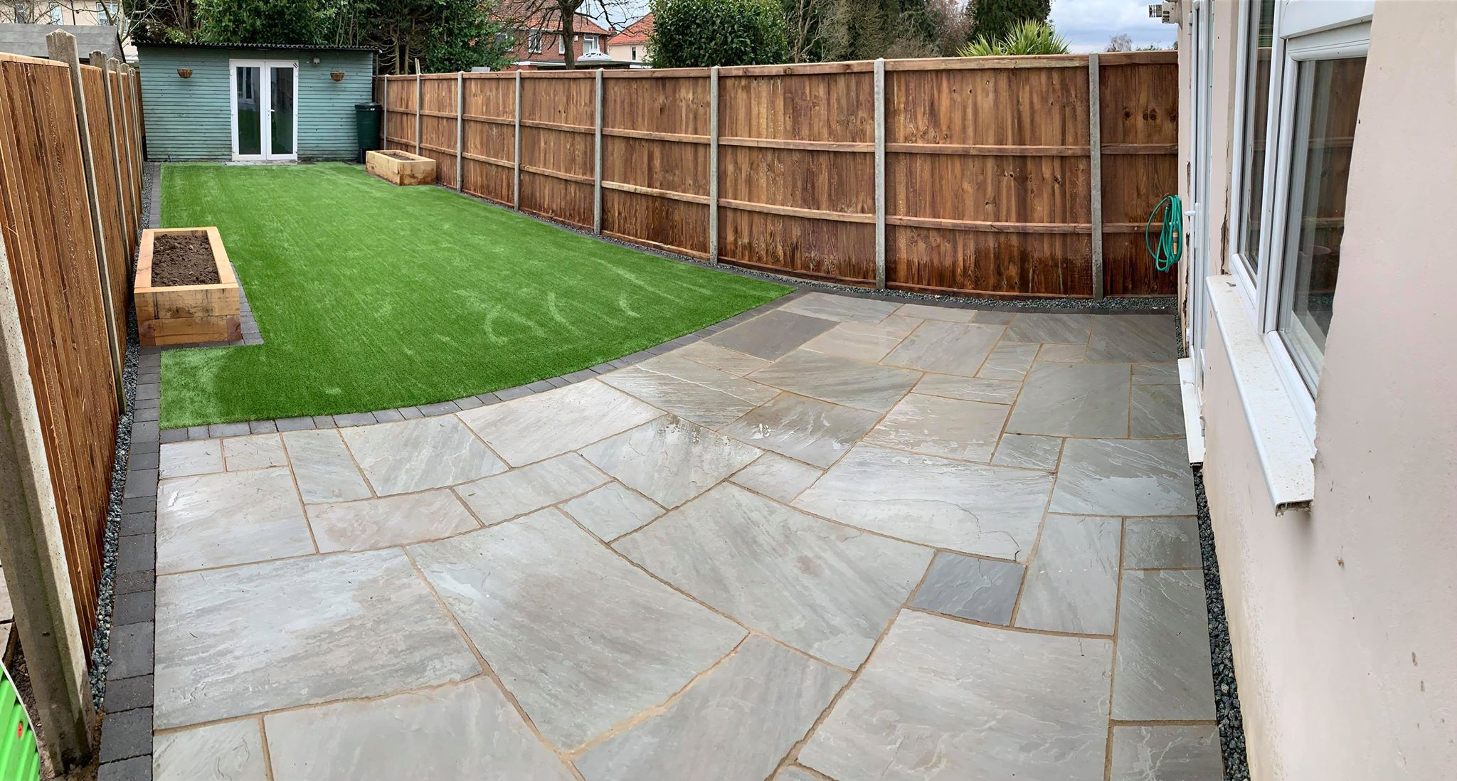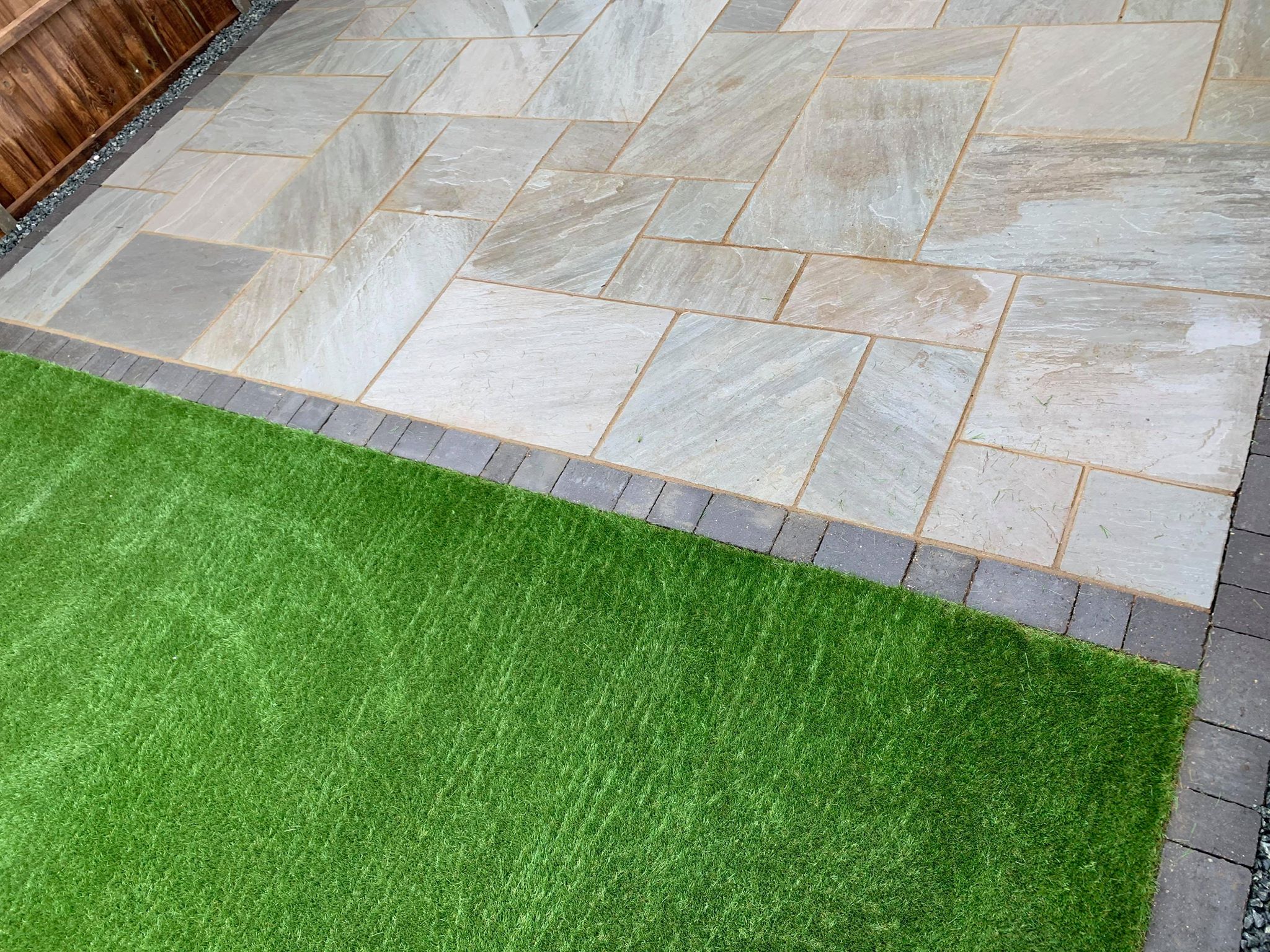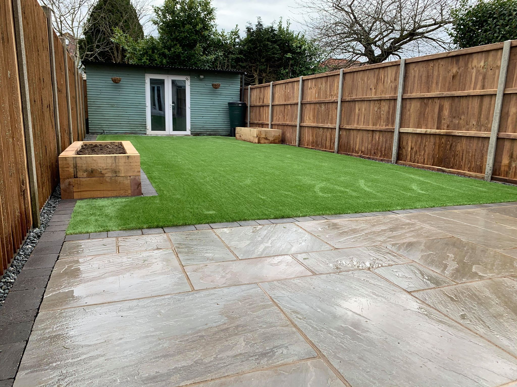 The decking area was removed and replaced with some fresh light grey sandstone and framed with Brett charcoal setts. With a lovely level run off straight onto the wonderful idol artificial grass. Once again framed in with the Brett charcoal sets. We gave the garden some small oak sleeper beds for minimal planting and also to give the garden a small piece of height. Finished off with Norwegian granite sprinkled around the edges.