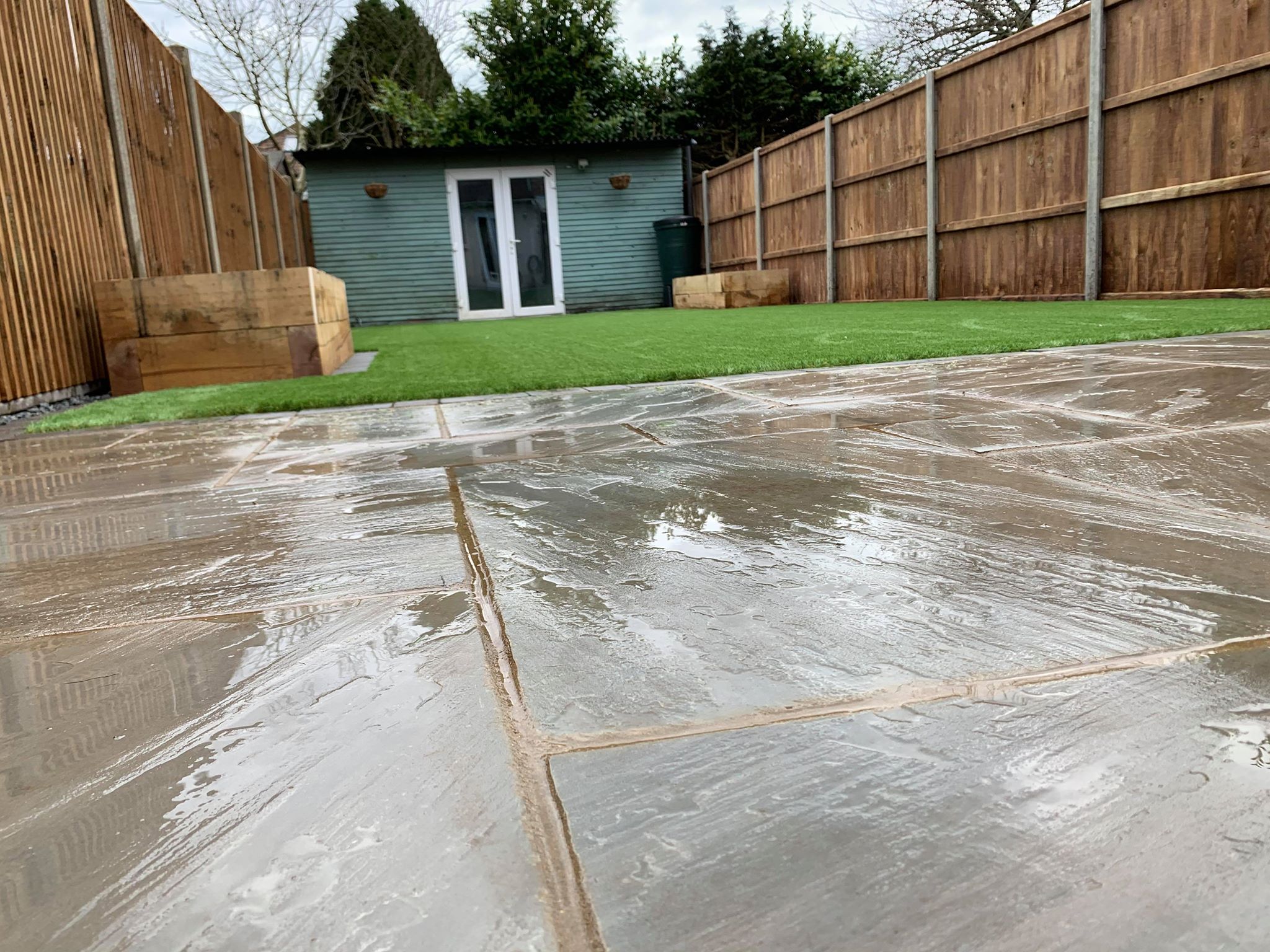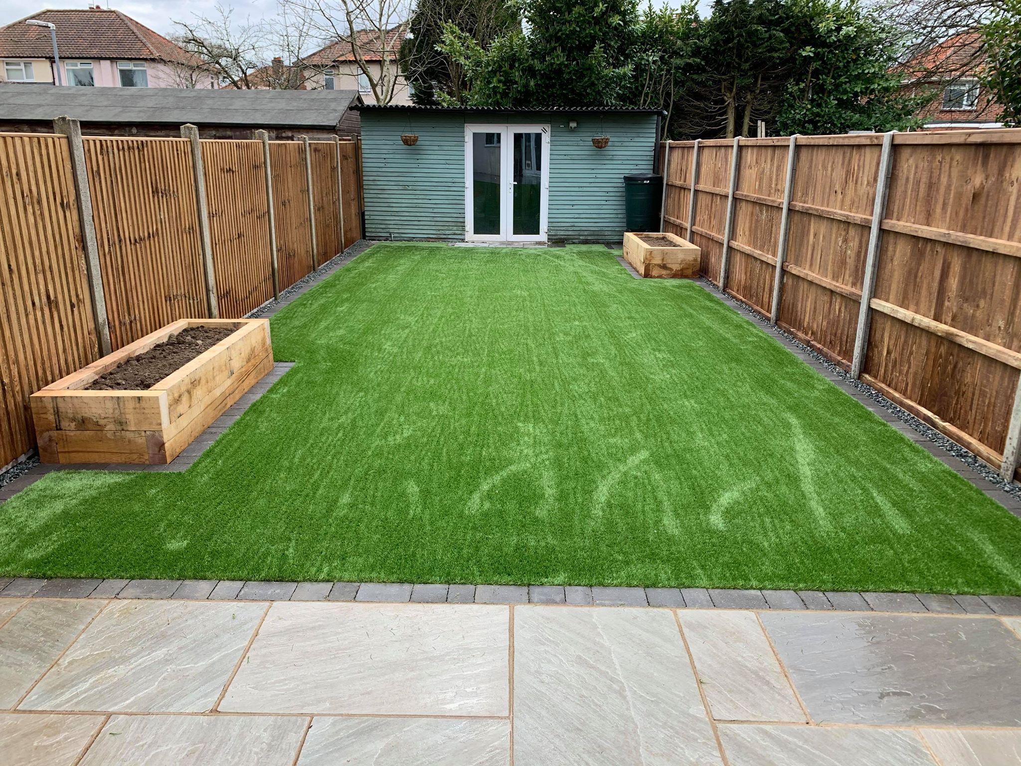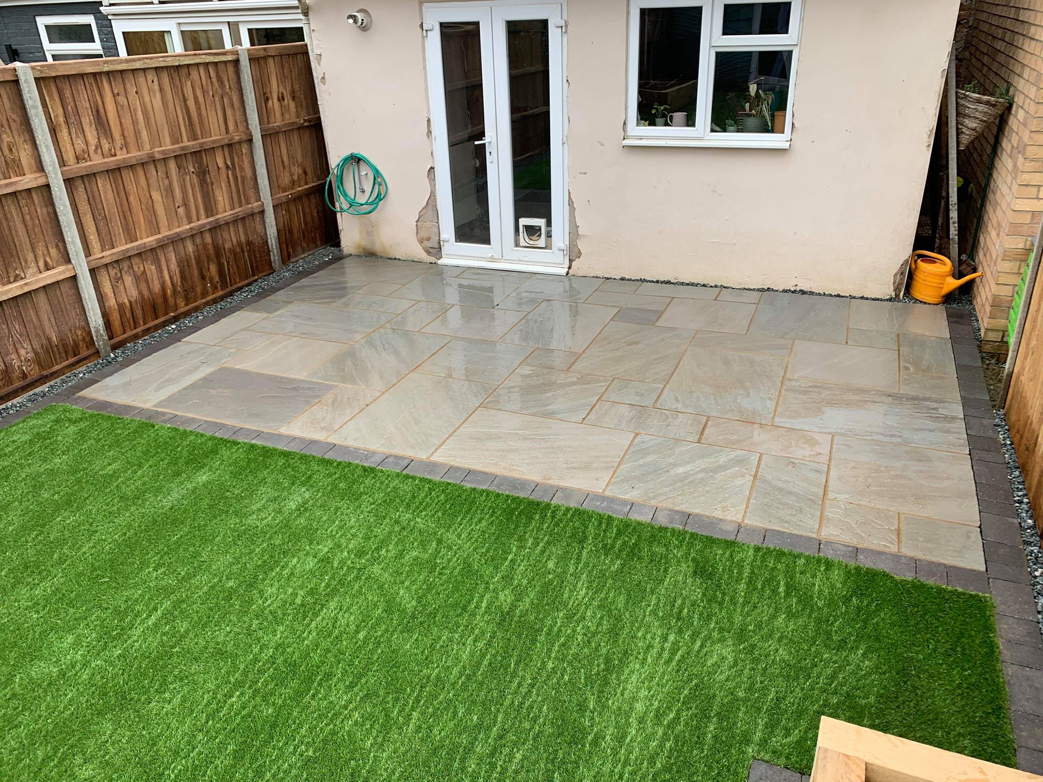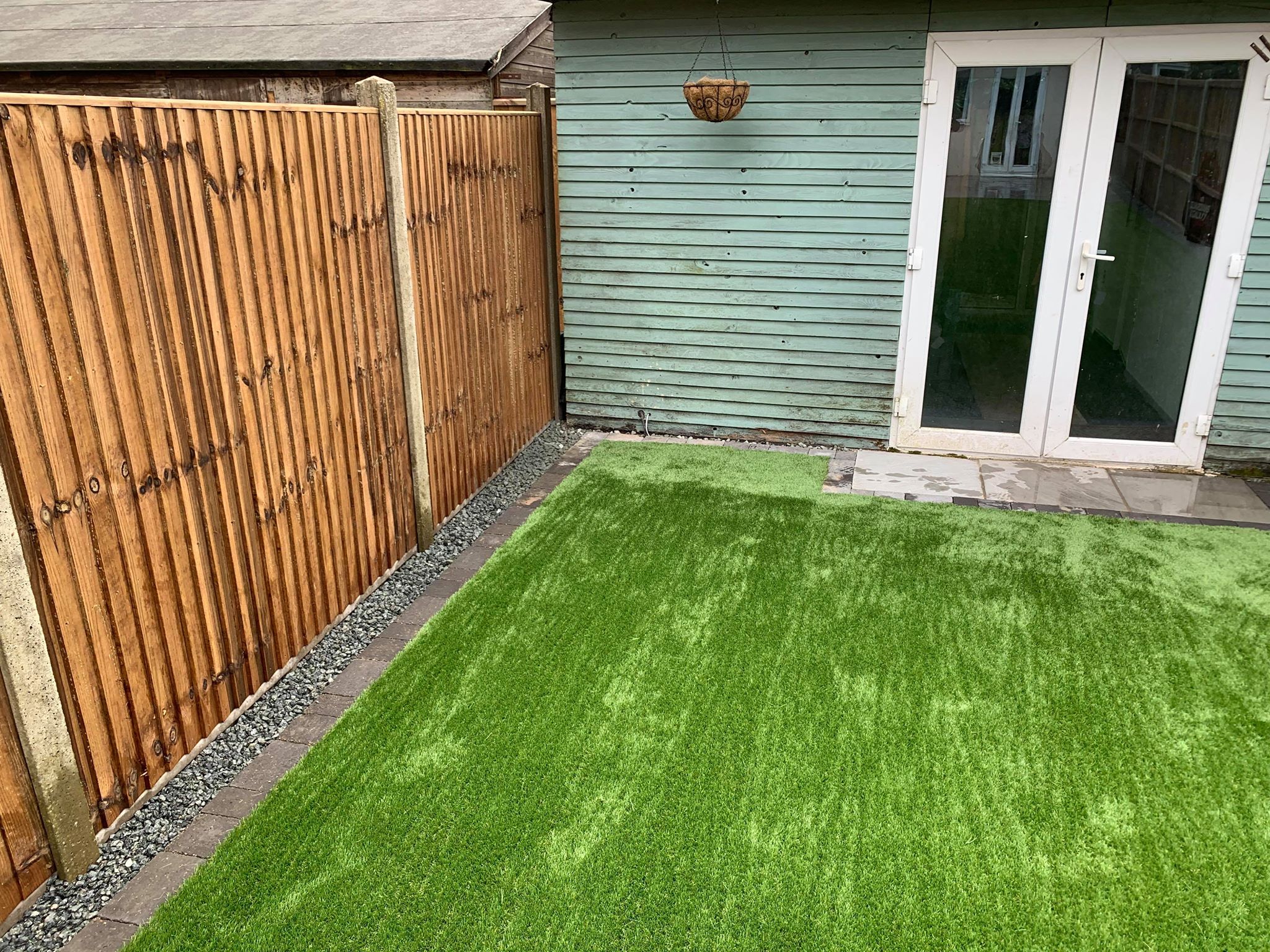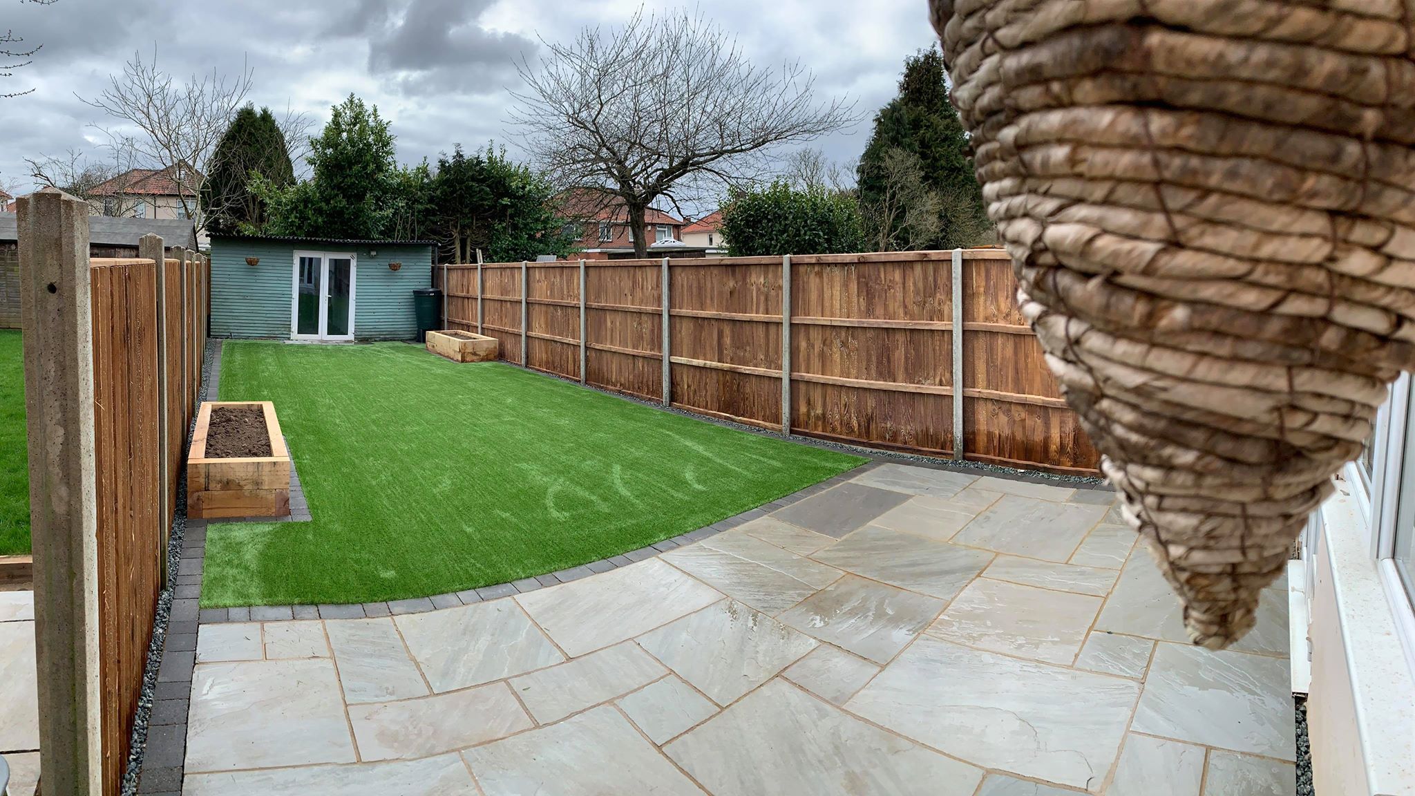 The decking area was removed and replaced with some fresh light grey sandstone and framed with Brett charcoal setts. With a lovely level run off straight onto the wonderful idol artificial grass. Once again framed in with the Brett charcoal sets. We gave the garden some small oak sleeper beds for minimal planting and also to give the garden a small piece of height. Finished off with Norwegian granite sprinkled around the edges.