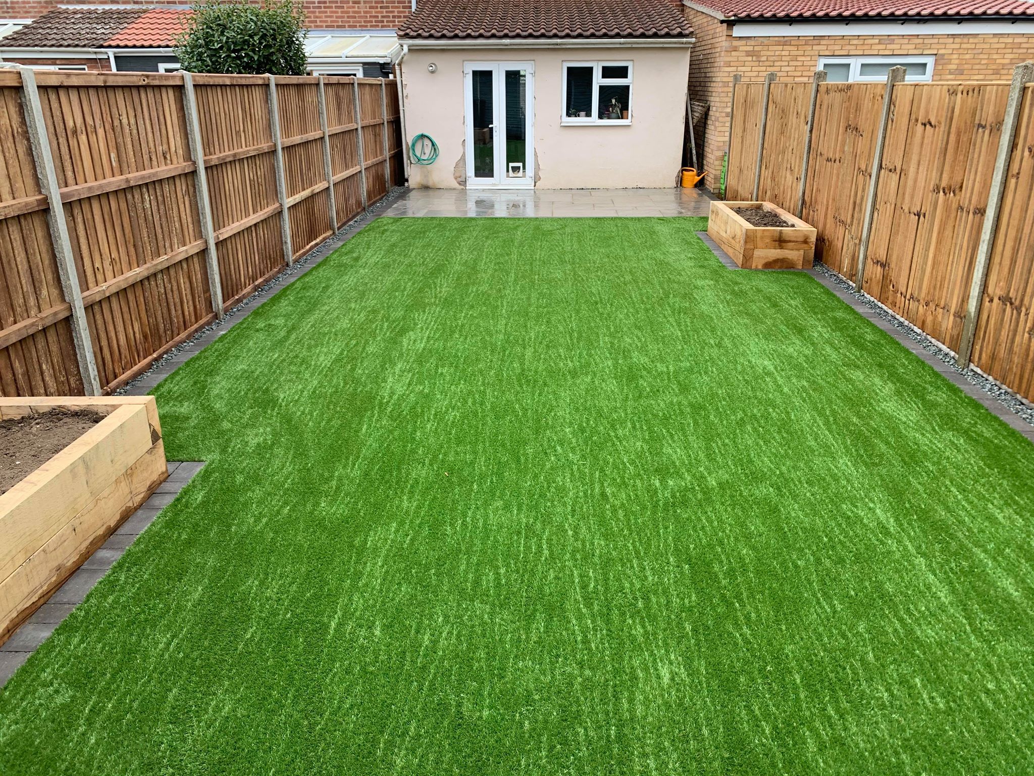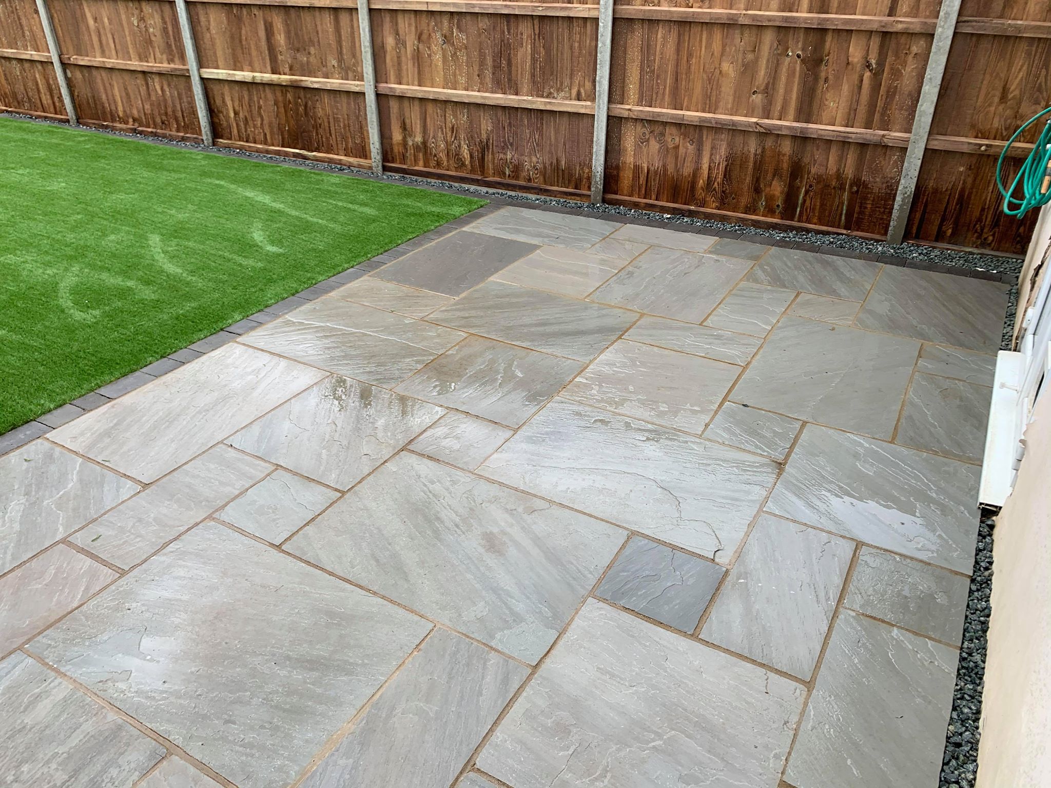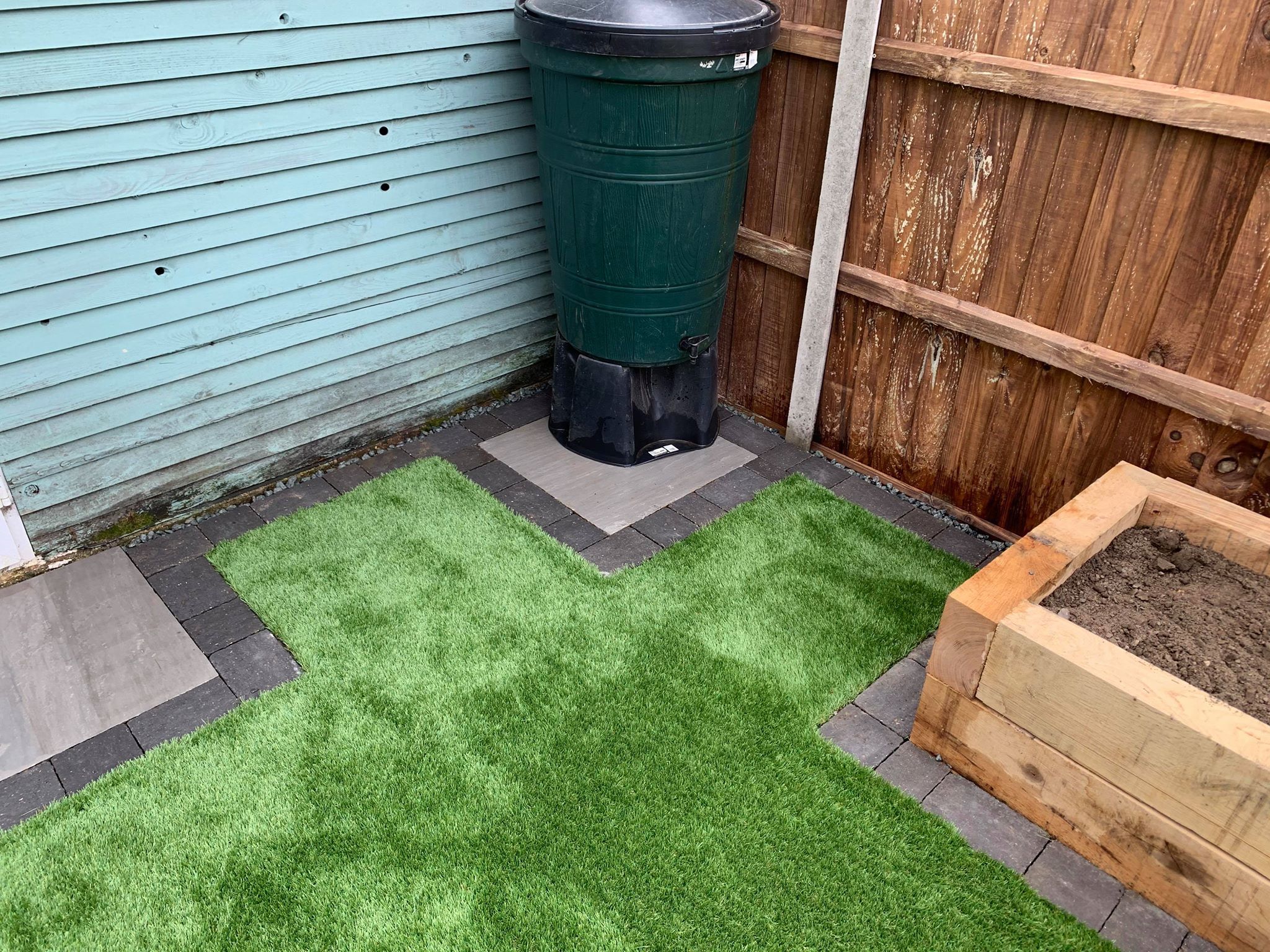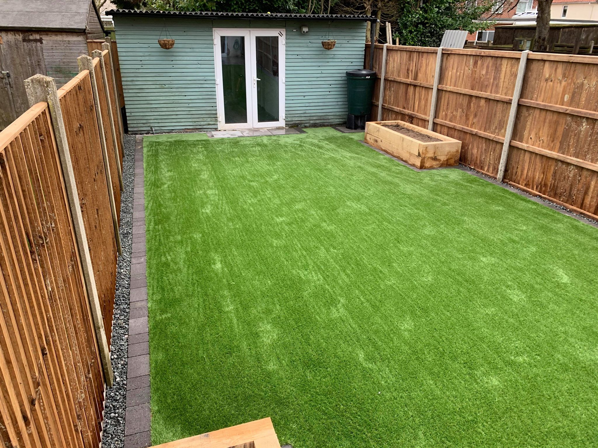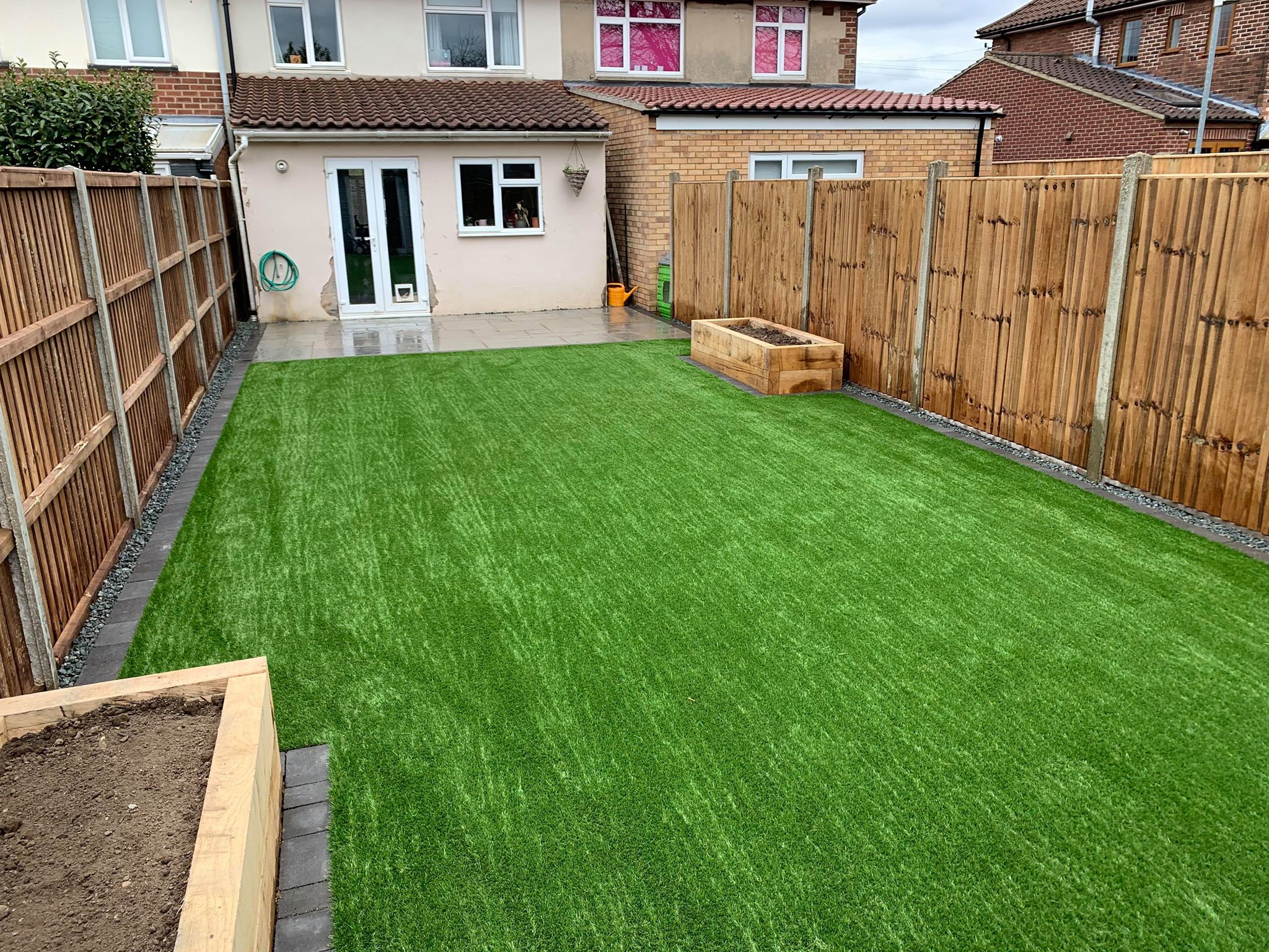 The decking area was removed and replaced with some fresh light grey sandstone and framed with Brett charcoal setts. With a lovely level run off straight onto the wonderful idol artificial grass. Once again framed in with the Brett charcoal sets. We gave the garden some small oak sleeper beds for minimal planting and also to give the garden a small piece of height. Finished off with Norwegian granite sprinkled around the edges.